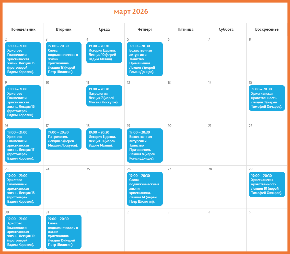 С Божией помощью начинаем 6-й месяц обучения из восьми. В феврале состоялось 13 лекций — на 2-3 лекции больше плана, согласно которому за 8 месяцев должно пройти ~ 90 лекций. В марте запланировано еще больше — 16 лекций, на 6 лекций больше плана, но часть из них отменится из-за срочных поездок священников в Великий пост, просто пока еще даты поездок неизвестны. В апреле же будет мало лекций в связи с Пасхой.
